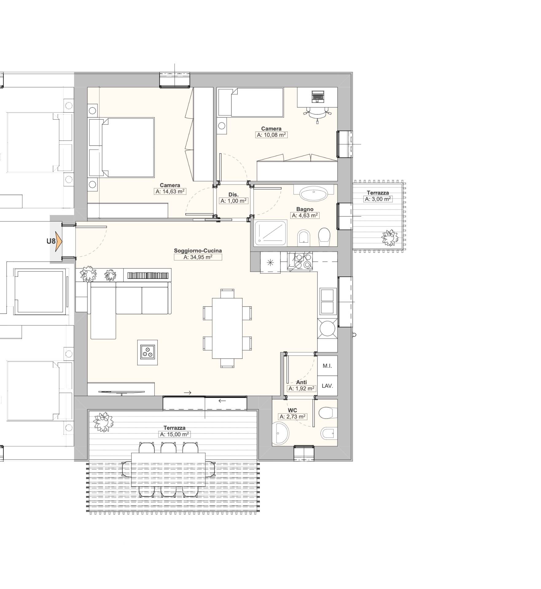 Residence Piave - UNITA' 8 - nuova futura costruzione, appartamento al piano secondo ed ultimo, composto da ingresso open space con angolo cottura e terrazzo abitabile, due camere, due bagni finestrati e garage.
